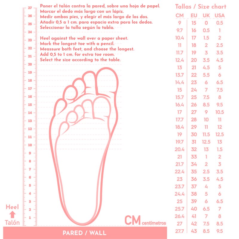 | Insole CM. | 9.7 | 10.4 | 11 | 11.7 | 12.4 | 13 | 13.7 | 14.4 | 15 | 15.7 | 16.4 | 17 | 17.7 | 18.4 | 19 | 19.7 | 20.4 | 21 | 21.7 | 23.2 | 24 | 24,5 | 25 | 25,8 | 26,2 | 27 | 27,5 | 27.7 | 28.4 | 29 |