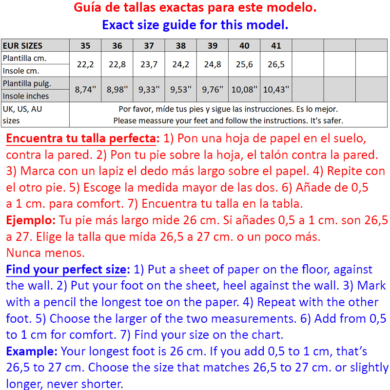 Here is an ORIENTATIVE guide to European sizes (including Spain and Portugal), and their correspondence with foot measurements in centimetres, as well as with American and English sizes.
