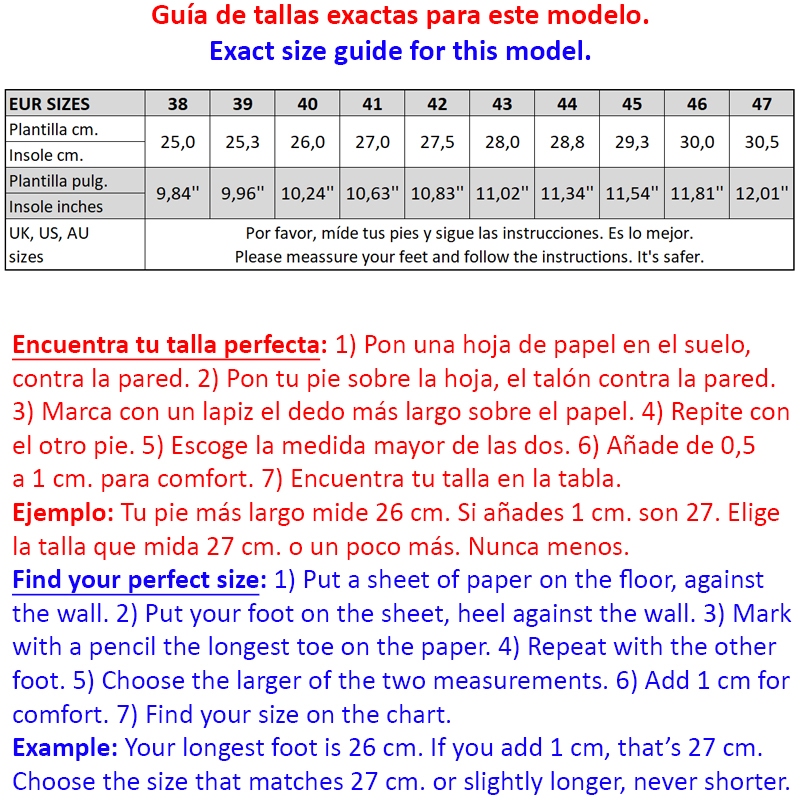 Here is an ORIENTATIVE guide to European sizes (including Spain and Portugal), and their correspondence with foot measurements in centimetres, as well as with American and English sizes.