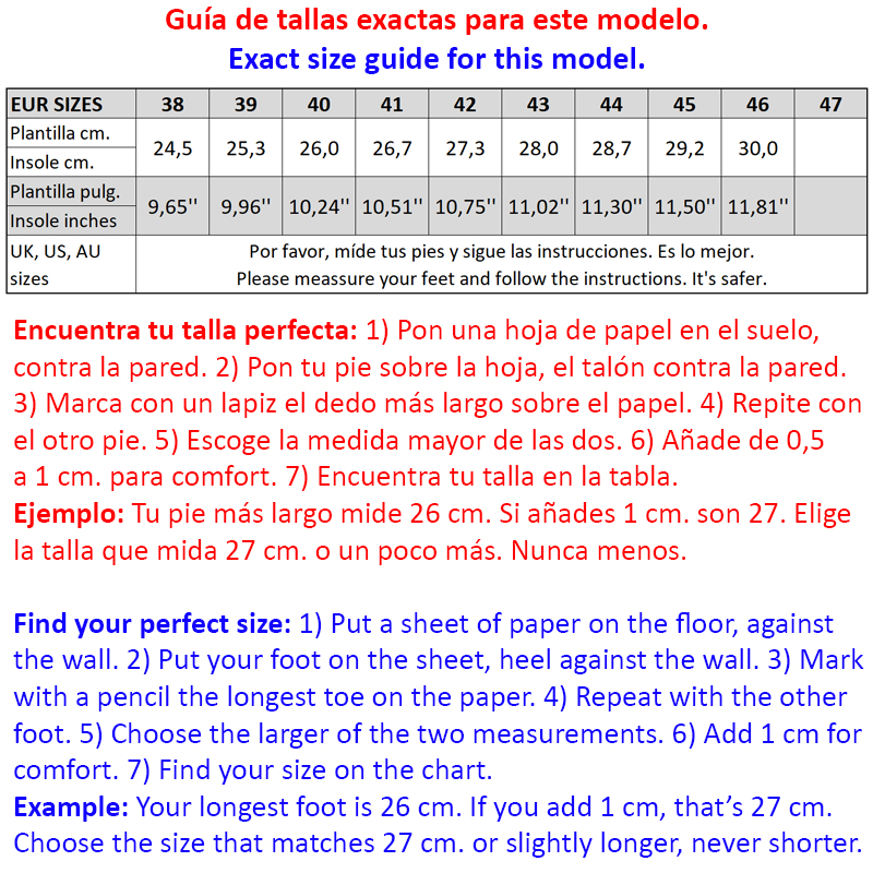 Here is an ORIENTATIVE guide to European sizes (including Spain and Portugal), and their correspondence with foot measurements in centimetres, as well as with American and English sizes.