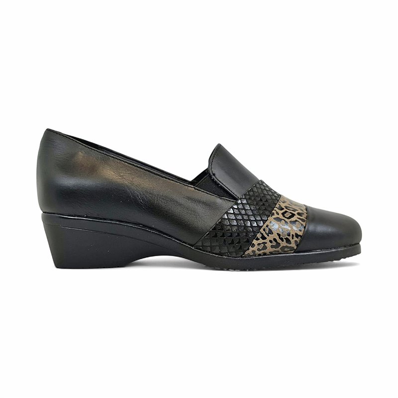 The 5712 model stands out with its loafer-inspired shape and elastic sides, offering practicality with a stylish edge. The subtle animal print detail on the vamp adds personality without losing its classic appeal. With a 4 cm wedge, these shoes give a gentle lift while keeping your feet comfortable. They pair beautifully with jeans, smart trousers or skirts, making them suitable for work or casual outings.