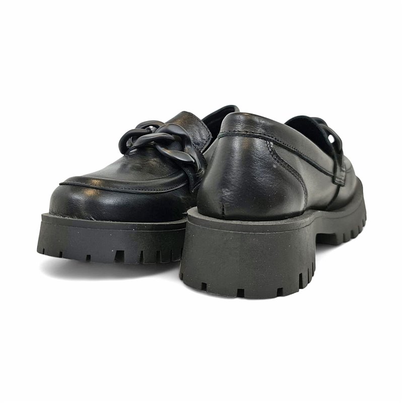 The outer finish in patent leather (or smooth leather for the black version) communicates quality and ease of care. The slip-on construction means you can put them on and off in no time, while the bold chain embellishment adds a distinctive touch without going overboard. Produced in Spain, this model reflects careful craftsmanship and durability for your repeated wear.