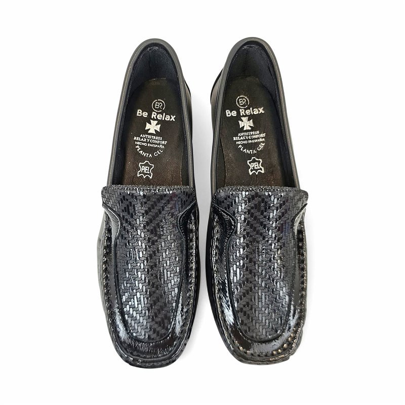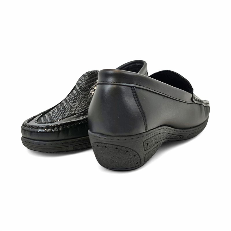 Estos mocasines de piel blanda con licra elástica combinan confort y diseño sencillo, ideales para quien busca calzado fiable en su día a día. El material exterior de piel blanda abraza el pie con suavidad, mientras que el vamp de tejido elástico permite el ajuste sin molestias. La suela de goma antideslizante añade seguridad en pisos resbaladizos. De color negro, modelo 3080, encaja tanto con looks formales como informales.