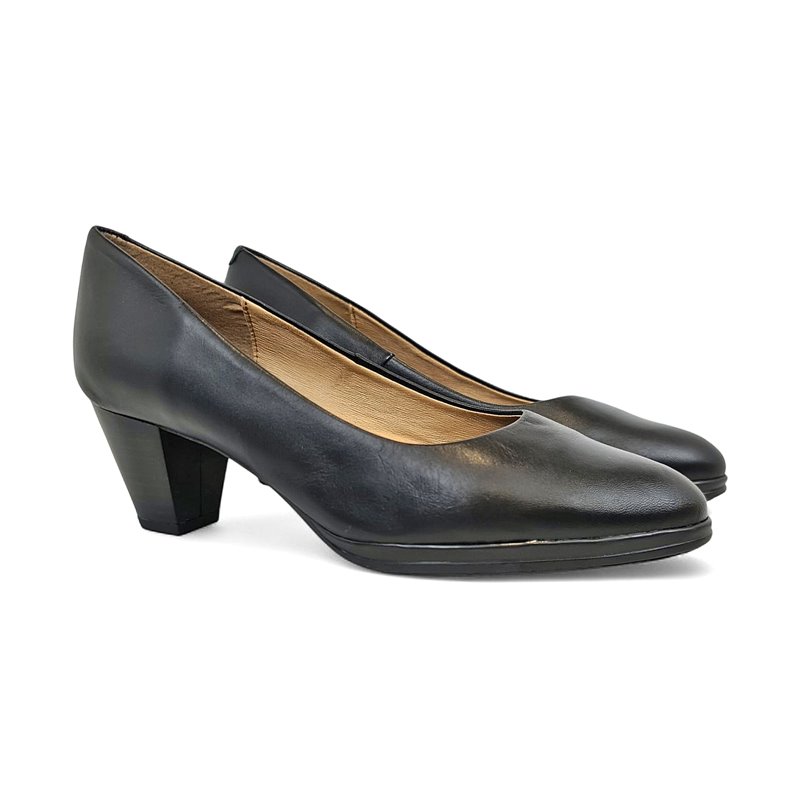 Te verás elegante y segura con estos zapatos de salón en piel napa negra, tacón medio y plantilla de gel que aporta confort durante todo el día; perfectos con vestido o falda para oficina o evento.